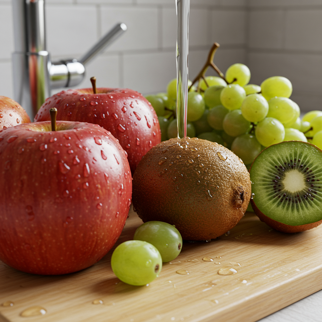 껍질에 털이 있거나 요철이 있는 과일(예: 키위, 복숭아)은 부드러운 솔을 사용하여 껍질 표면의 이물질이나 잔류 농약을 물리적으로 제거하는 것이 효과적입니다. - ⑦ 물에 잠시 담가두기: 잔류 농약 희석 효과