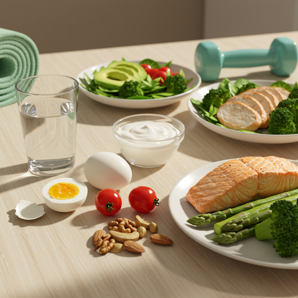 • 단백질 위주 간식: 삶은 계란, 그릭 요거트 (무가당), 저지방 우유, 두유, 닭가슴살 육포