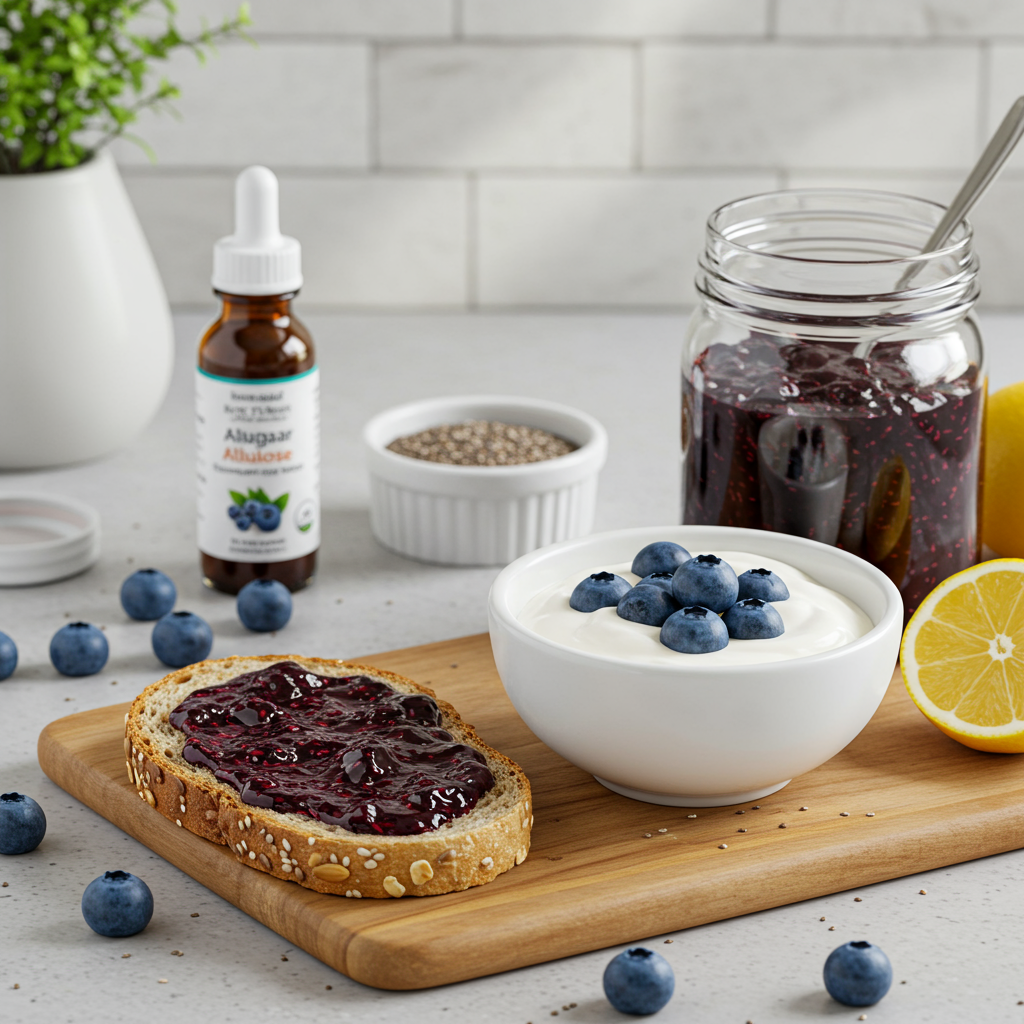 - 재료: 냉동 블루베리 500g, 액상 알룰로스 100~150g, 물 50ml, 레몬즙 1큰술, 치아씨드 1~2큰술 (선택 사항)