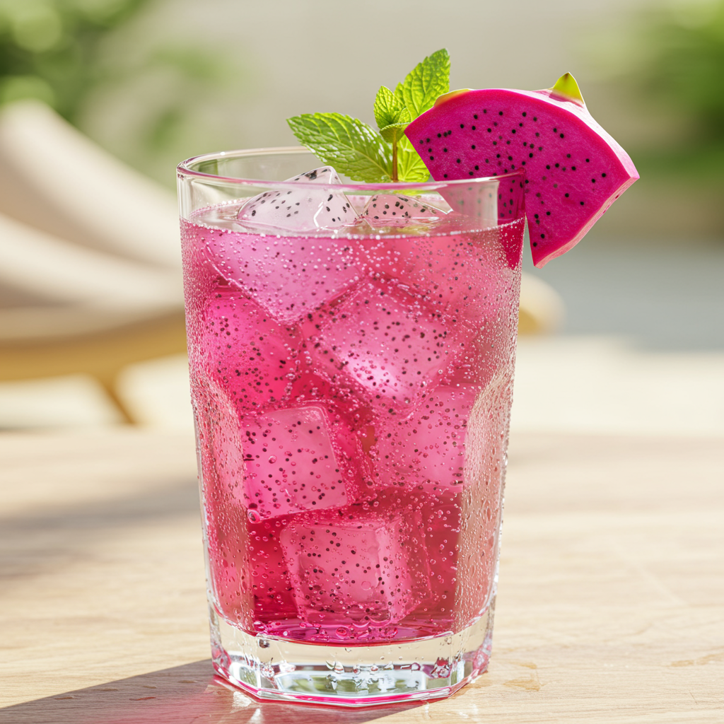 - 장식하기: 남은 드래곤후르츠 과육 조각과 레몬/라임 슬라이스, 민트 잎으로 예쁘게 장식하면 홈메이드 드래곤후르츠 에이드 완성!