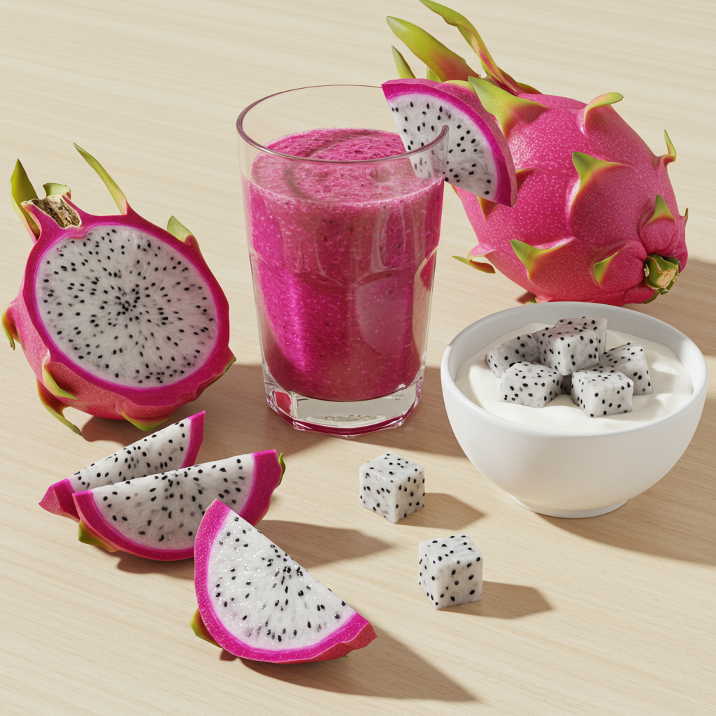- 드래곤후르츠 요거트 스무디: 드래곤후르츠 과육, 플레인 요거트, 우유, 꿀을 넣고 갈면 든든한 아침 식사 대용으로 좋아요.