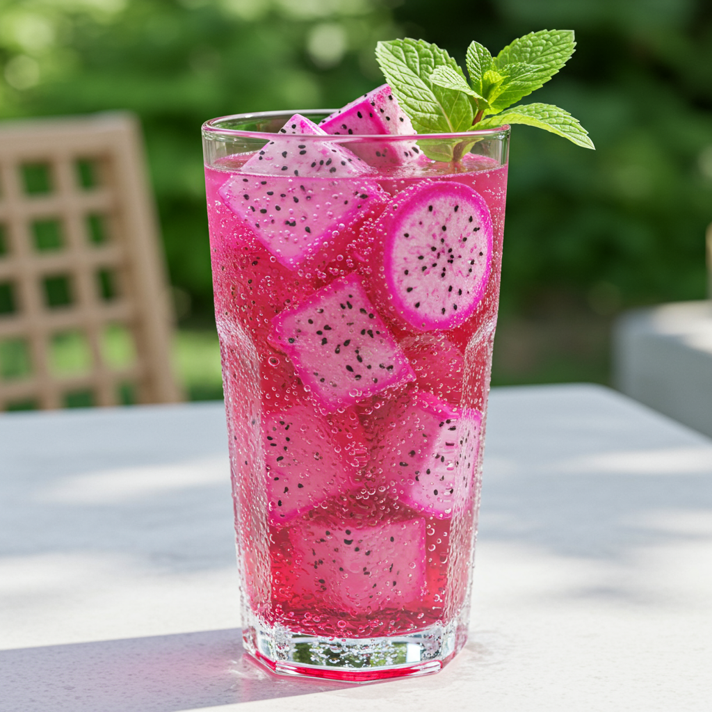 - 장식하기: 남은 드래곤후르츠 과육 조각과 레몬/라임 슬라이스, 민트 잎으로 예쁘게 장식하면 홈메이드 드래곤후르츠 에이드 완성!