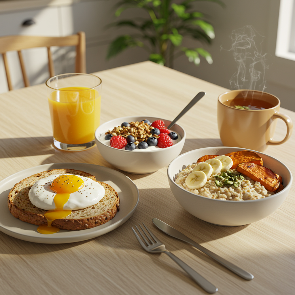 🍳 5가지 추천 메뉴: 계란, 오트밀, 그릭 요거트, 고구마 조합, 통곡물 빵으로 단백질과 식이섬유를 꽉 채우세요.