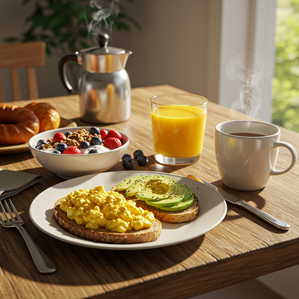단백질, 식이섬유, 복합 탄수화물이 균형 잡힌 아침 식사는 혈당을 천천히 안정적으로 올려주어 하루 종일 꾸준한 에너지를 공급합니다. 혈당이 급격히 오르내리지 않으니, 오전 내내 활력과 집중력을 유지하는 데 큰 도움이 됩니다.