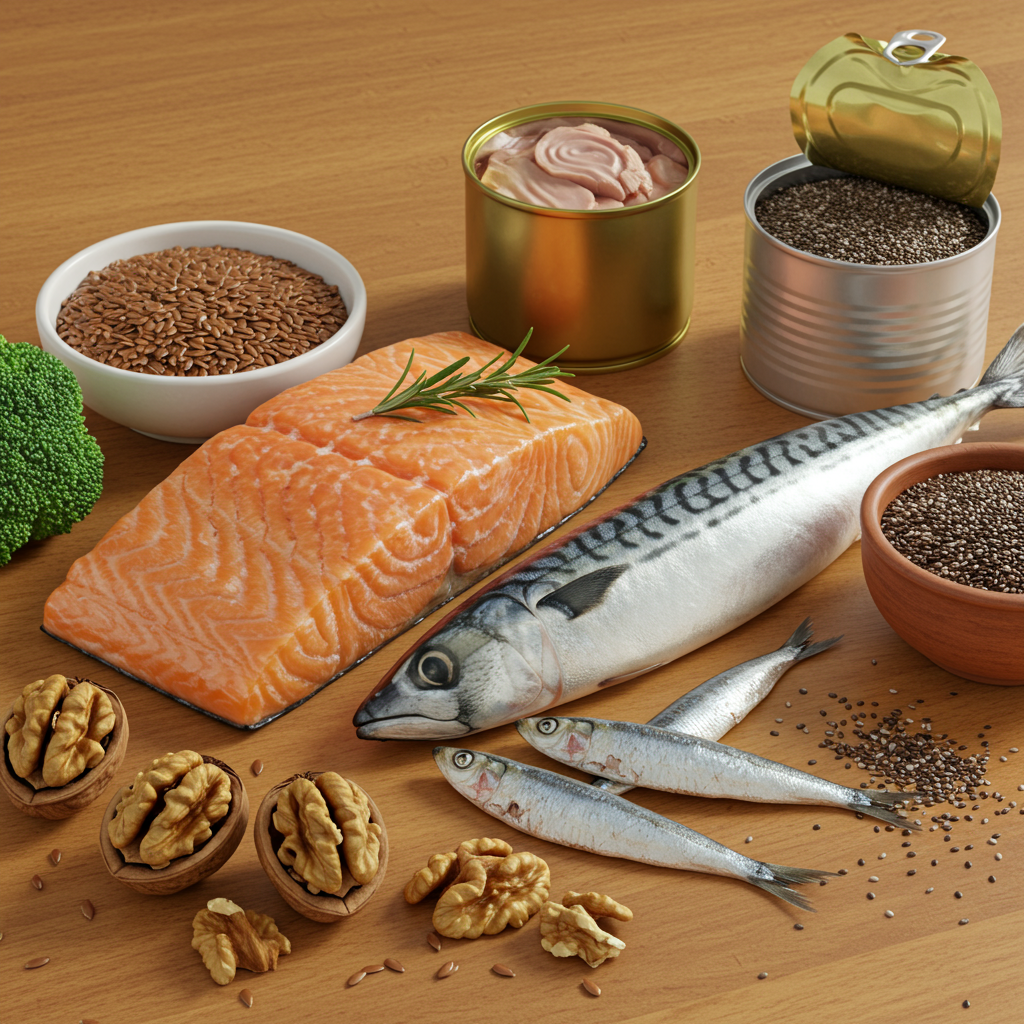 연어, 고등어, 정어리, 참치 (생선) / 호두, 아마씨, 치아씨드 (견과류/씨앗)