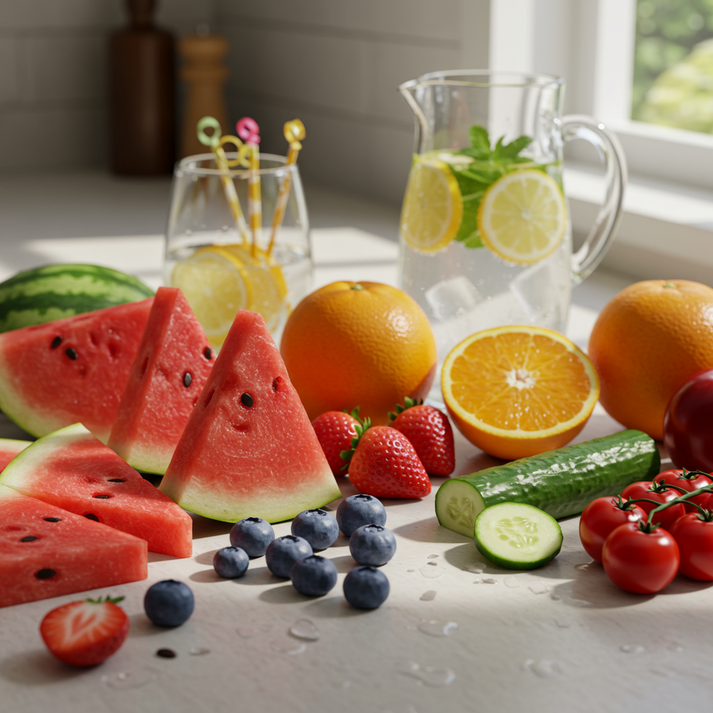 단순히 물만 마시는 것보다 과일이나 채소를 통해 수분을 보충하면, 몸에 꼭 필요한 전해질(칼륨, 마그네슘 등)과 비타민을 함께 섭취할 수 있어 탈수 예방에 더욱 효과적입니다.