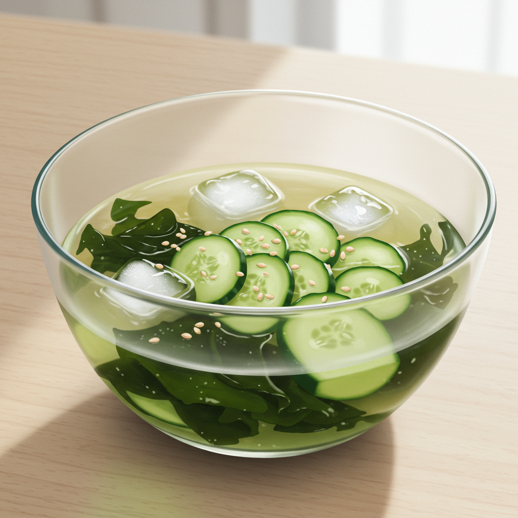 - 효능: 미역의 알긴산은 혈중 콜레스테롤을 낮추고 혈압을 안정시키는 데 도움을 줍니다. 오이는 수분과 칼륨이 풍부해 나트륨 배출에 효과적이에요.