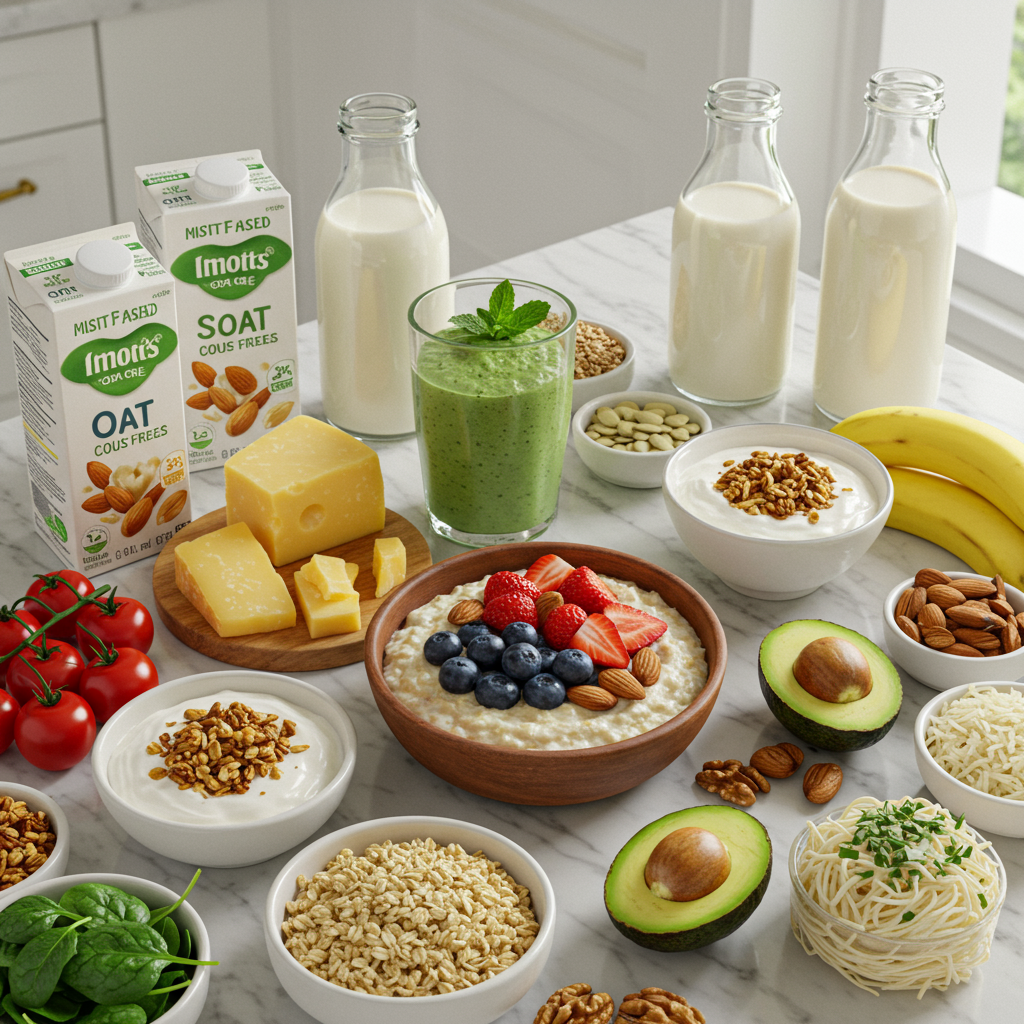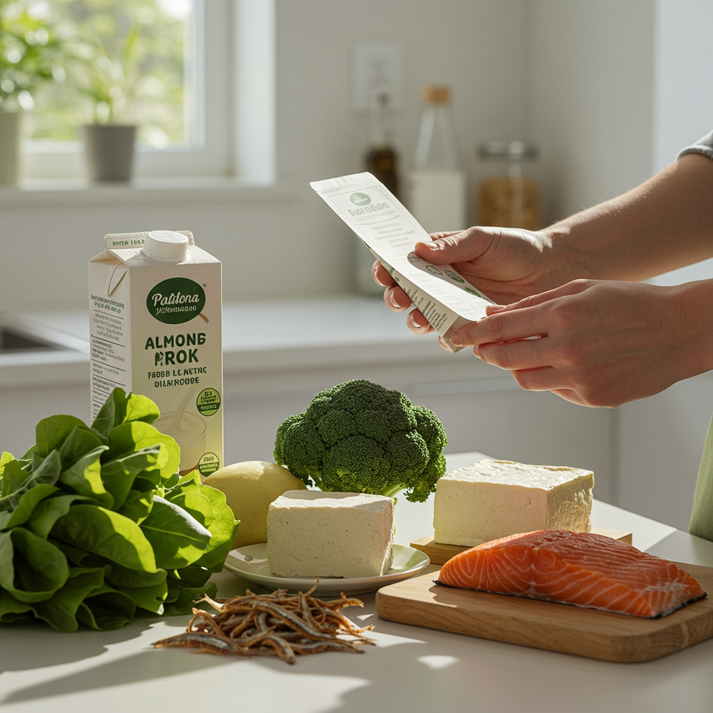 - 칼슘: 뼈째 먹는 생선(멸치, 뱅어포), 녹색 잎채소(케일, 브로콜리), 두부, 해조류, 칼슘 강화 식물성 우유.