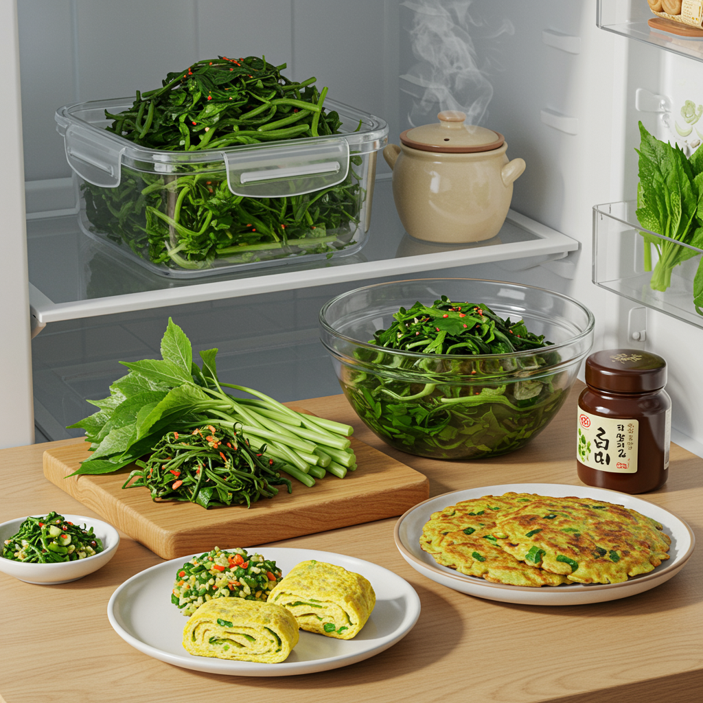 - 나물 데치기: 주말에 냉이, 취나물 등 데쳐야 하는 나물은 미리 데쳐서 찬물에 헹군 후 물기를 꼭 짜서 밀폐 용기에 담아 냉장 보관하세요. (3~4일 보관 가능)