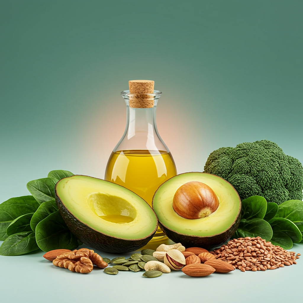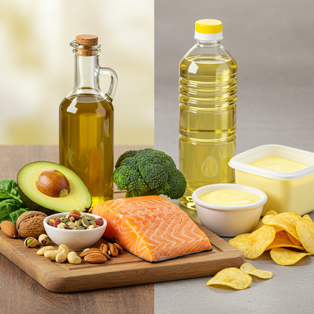 식재료 예시 올리브유, 아보카도 오일, 코코넛 오일, 견과류, 씨앗류, 등푸른생선, 아보카도 마가린, 쇼트닝, 튀김류, 가공식품, 옥수수유, 콩기름, 해바라기씨유
