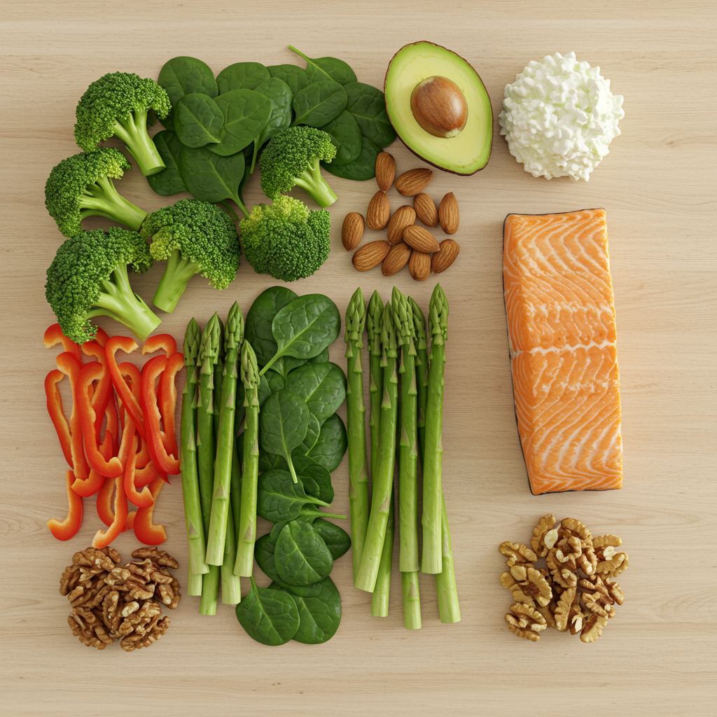 A: 비전분성 채소(잎채소, 브로콜리, 오이 등)는 탄수화물 함량이 매우 낮고 식이섬유가 풍부하여 케토제닉 식단에 매우 중요합니다. 충분히 섭취해도 순 탄수화물(총 탄수화물 - 식이섬유) 섭취량을 크게 넘지 않으니 걱정하지 마세요.